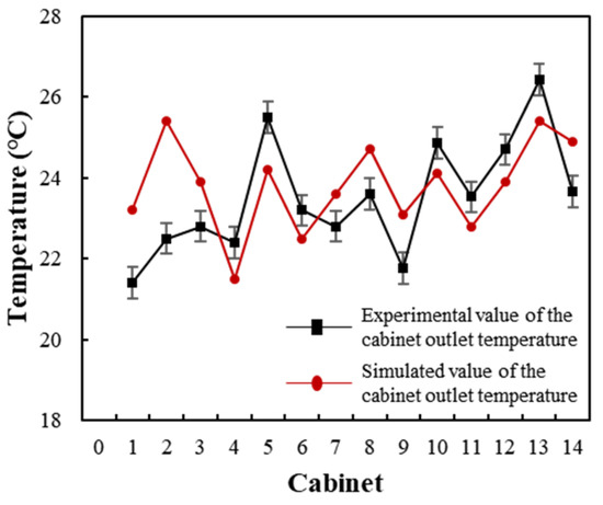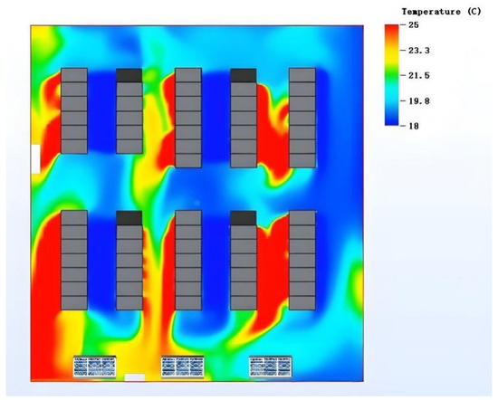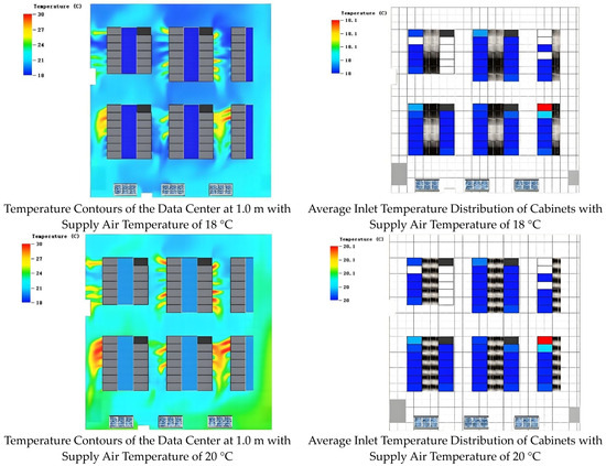 34]. In the aforementioned research, the air supply temperature from the air conditioning system was consistently maintained at 18 °C. Notably, after enclosing the cold aisle, the inlet temperature of the cabinets remained at 18 °C. Therefore, a simulation study was conducted to investigate the impact of increasing the air conditioning temperature after the cold aisle was enclosed on the cooling effectiveness of the data center.