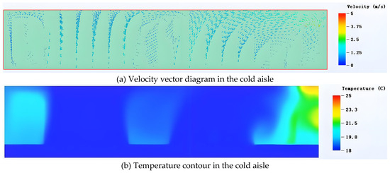 Table 3. From the table, it can be observed that the RHI evaluation indicator of the data center increased after the cold aisle was enclosed, while enclosing the hot aisle led to a decrease in the RHI indicator. This is because, when the hot aisle is enclosed, the air supply in the cold aisle directly flows to the air conditioning unit’s return air inlet, resulting in a waste of cooling capacity. Therefore, enclosing the cold aisle proves to be more effective than enclosing the hot aisle. It is recommended that the layout of this data center utilize the closed cold aisle configuration.