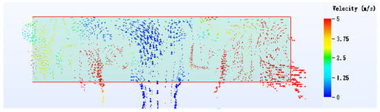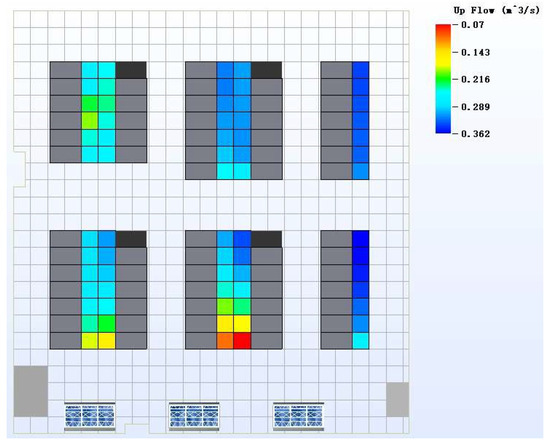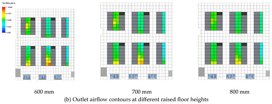 Figure 8. This discrepancy is attributed to the uneven pressure distribution within the underfloor plenum. Meanwhile, there is a hot and cold aisles arrangement in the data center room, which is not closed, and the cold airflow will flow back into the hot aisle, resulting in a phenomenon of mixing cold and hot air. When the raised floor height increases from 600 mm to 800 mm, there are no negative values for the airflow volume at the floor grilles and the airflow volume range is −0.025 m