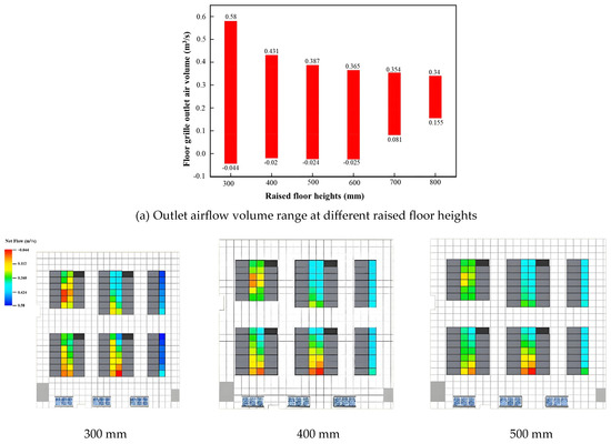 Figure 11b, it can be observed that as the raised floor height increased, the airflow volume at the perforated floor grilles gradually increased, and the disparity in airflow volume at the grilles also continued to diminish. When the height was increased from 300 mm to 500 mm, negative values for the airflow volume were observed at the grilles closer to the air conditioning side. As mentioned above, the minimum airflow volume for a 300 mm raised floor height is −0.044 m