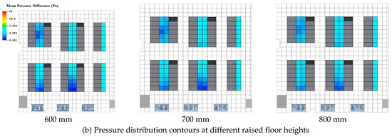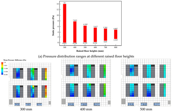 Figure 12a illustrates the pressure distribution range between the perforated floor grilles and the floor plane at different raised floor heights. At a raised floor height of 300 mm, the static pressure zone has the highest value, ranging from 0.031 Pa to 14 Pa. To facilitate the analysis and comparison of the static pressure distribution between the floor grilles and the floor plane at different raised floor heights, the static pressure distribution range at a height of 300 mm was used as a standardized reference range. It can be observed from the figure, as the raised floor height increases, the differences in static pressure between the perforated floor grilles and the floor plane within the data center decrease progressively.