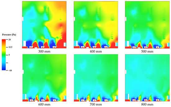 Figure 13. When the raised floor height is 300 mm or 400 mm, the blue areas under the floor grilles in the cold aisle near the air conditioning unit are noticeably prominent, indicating significant negative pressure in this region, which hampers the supply airflow from the plenum into the cold aisle, resulting in reduced airflow at the floor grille outlets. Conversely, the red areas beneath the floor grilles farther from the air conditioning unit are clearly visible, indicating higher pressure in this region, leading to increased airflow at the floor grille outlets. The overall pressure distribution within the plenum at this raised floor height is extremely uneven, and the pressure distribution along the cold aisle in the data center is also irregular. As the raised floor height increases from 500 mm to 800 mm, the blue area near the air conditioning unit gradually diminishes in size and intensity, indicating an improvement in the static pressure at the floor grille outlets near the air conditioning unit. Meanwhile, the red area farther from the air conditioning unit gradually disappears, indicating a decrease in static pressure within the plenum. Once the raised floor height reaches 600 mm, the horizontal pressure distribution within the plenum remains largely unchanged, suggesting that further increases in the raised floor height do not significantly affect the horizontal pressure within the floor plenum.