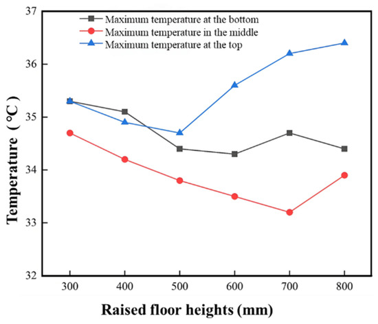 It should be pointed out that the airflow distribution ultimately affects the overall heat exchange process in the data center, resulting in variations in the temperature field. Therefore, the three cross-sectional areas for a temperature field simulation of the data center and cabinets at different raised floor heights, which are the bottom section (0.2 m), the middle section (1.0 m), and the top section (1.8 m), were selected. This simulation provides temperature values at different heights and the inlet and outlet temperatures of the cabinets. Notably, the minimum temperature at all three cross-sectional locations remains constant at 18 °C, while only the maximum temperature at each section varies. The maximum temperature changes at the three cross-sections are illustrated in