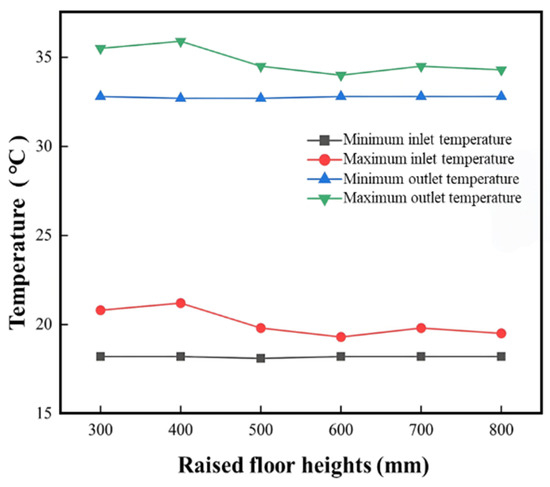 Figure 15 illustrates the distribution of average inlet and outlet temperatures for the cabinets. It can be observed that as the raised floor height increases, the minimum inlet and outlet temperatures remain relatively constant, while the maximum temperatures show a significant decrease. When the height reaches 600 mm, the maximum temperature at the cabinet inlet and outlet are 19.3 °C and 34 °C, respectively, and the difference between the maximum and minimum temperatures continues to diminish. However, as the height is increased further, this difference exhibits fluctuations, indicating that increasing the height has a limited impact on the temperature field at this point. As the raised floor height increases, the maximum cabinet inlet temperature initially rises and then decreases, while the minimum value remains relatively constant. This behavior is attributed to the presence of a high-temperature air mass at a height of 400 mm, causing an increase in temperature, with the highest temperature reaching up to 21.2 °C. The minimum value of the cabinet outlet temperature remains around 32.8 °C, while the maximum value shows a trend of first decreasing and then increasing as the raised floor height increases. The trend in the temperature difference between the inlet and outlet of the cabinets remains consistent.