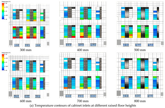 Figure 16a displays the cabinet inlet temperatures at different raised floor heights. It can be observed that as the floor height increases from 300 mm to 600 mm, the number of cabinets with high temperatures (indicated in red) significantly decreases, indicating a marked reduction in the average inlet temperatures of the cabinets, as well as a notable decrease in the range of temperature extremes. When the height exceeds 600 mm, fluctuations in inlet temperatures are observed, particularly at cabinet A14, which aligns with the fluctuations in temperature extremes shown in the simulations of