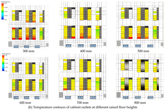 Figure 16b illustrates the cabinet outlet temperatures at different raised floor heights. It can be observed that as the floor height increases from 300 mm to 600 mm, the number of cabinets indicated in red significantly decreases, suggesting an increase in the number of cabinets with lower average outlet temperatures, as well as a notable reduction in the range of temperature extremes. However, when the height exceeds 600 mm, fluctuations in outlet temperatures are observed, particularly at cabinet A14, which corresponds with the fluctuations in temperature extremes seen in the simulations of