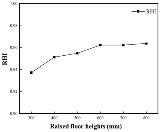 Figure 17. As the raised floor height increased, there was a notable rise in the RHI evaluation indicator for the data center. However, once the height reached 600 mm, the RHI remained relatively unchanged, indicating that the airflow distribution within the data center was no longer affected by the raised floor height at this point.