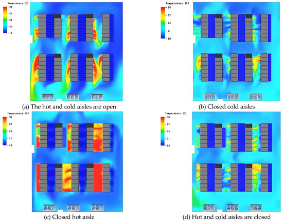 This study simulated four different operational conditions of airflow distribution in the data center: (1) neither the cold aisle nor the hot aisle is enclosed, (2) only the cold aisle is enclosed, (3) only the hot aisle is enclosed, and (4) both the cold and hot aisles are enclosed. Schematic diagrams of the enclosed cold and hot aisles are shown in