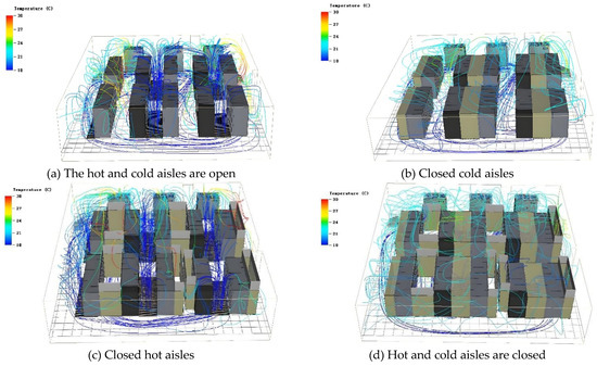 Figure 20 presents the streamlines of the air conditioning units in the data center under four different operational conditions. The figure effectively reflects the distribution of supply and return airflow from the air conditioning system, as well as the variations in airflow temperature within the data center. It is evident from the figure that when the cold and hot aisles are not enclosed, significant mixing of hot and cold airflows occurs in the air conditioning system, leading to increased inlet temperatures for the cabinets, which is detrimental to the heat dissipation of the server equipment. After separately enclosing the cold and hot aisles, the airflow streamlines of the air conditioning system become clearer, with hot and cold airflows effectively isolated. The mixing of airflows is significantly improved, allowing the cooling capacity of the air conditioning system to be fully utilized for cooling the server equipment, resulting in an overall reduction in the temperature of the data center, enhanced airflow distribution, and increased efficiency of cooling capacity utilization.