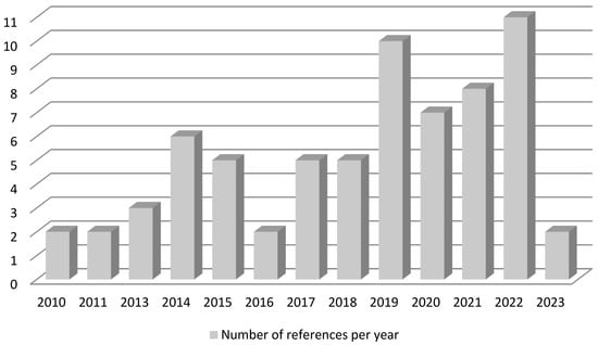 The criteria discussed above narrowed the number of references to 68, covering a period from 2010 to 2023 (see Figure 2). As shown in Figure 3, Revit is the primary BIM tool used in research studies, with 42% of the selected references, compared to 20% for ArchiCAD. Figure 3 also establishes four categories within the selected references according to their focus and nature: overviews, comparative studies, studies using ArchiCAD, and studies using Revit.