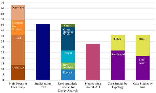 Since all these categories include Revit or ArchiCAD, an analysis was conducted to determine the frequency of inclusion of each one of these authoring tools. It considered the references centered on each authoring tool, comparative studies, and an overview or review that compared Revit, ArchiCAD, or both with other tools. Figure 3 showcases the frequent use of Revit in terms of the literature, which aligns with the percentage representing Revit-centered studies among the overall selection of references for this literature review. However, in light of the observation about the approach to the BIM-based BEM in Revit, Figure 3 also highlights the actual Autodesk tools used for energy analysis. Revit internal energy analysis functionalities represent only 12% of selected studies, even less than Ecotect, an obsolete tool since 2015. This percentage includes mainly the studies that used data generated in Revit to illustrate some aspects of energy analysis findings. Nonetheless, as the same chart suggests, GBS and Insight are the sole tools used to exemplify energy analysis.