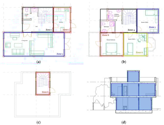 Geometric data of the living laboratory Dar Nassim. (a) Ground floor. (b) First floor. (c) Terrace. (d) Section.