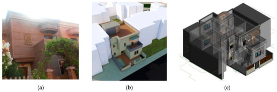 BIM representation of the baseline model. (a) Existing building before retrofitting. (b) ArchiCAD as-is model. (c) Revit as-is model.