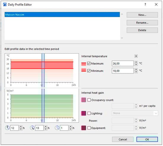 An operational profile with a residential occupancy type was created, with a daily schedule indicating no human activity and a ranging internal temperature between 18 °C and 26 °C (see Figure 7). This profile was assigned to all thermal blocks, including a wall-mounted gas boiler for heating and Window AC units for cooling as building systems.