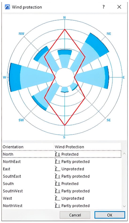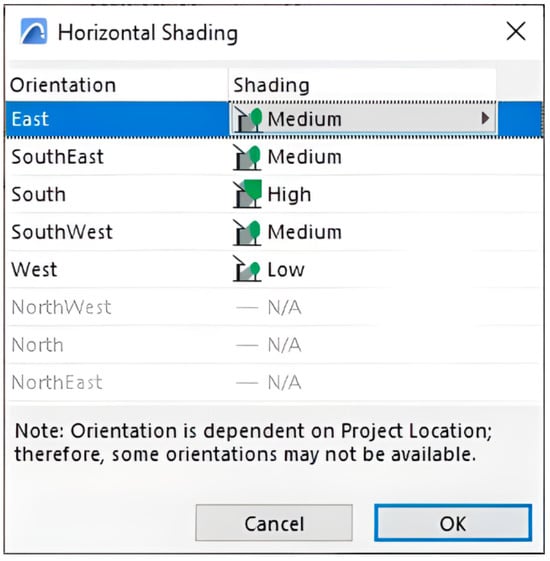 A Typical Meteorological Years (TMY) climate data file was uploaded and then matched with the exact location of the building. ArchiCAD generates a climate analysis that includes air temperature, relative humidity, solar radiation, and wind speed. Annual air temperature data indicate 46 °C as the highest temperature and 3 °C as the lowest, which verifies the accuracy of the climate analysis. Details about horizontal shading (see Figure 8) and wind protection (see Figure 9) were added. A solar analysis of all openings containing a glazing percentage was rerun to consider new adjustments.