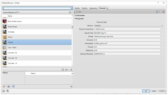 While ArchiCAD allows creating new material from scratch, Revit offers only the possibility to duplicate an existing material, thus inheriting a set of parameters that the user might not need (see Figure 11). In addition to many other inaccuracies highlighted by the existing literature with U-value calculators of Revit and ArchiCAD [,,], the approach to customization is the major difference between the two tools. While Revit has many limitations on the matter, ArchiCAD allows it, thus using only relevant parameters for each material. For better accuracy, there is also the possibility to override the calculated U-value.