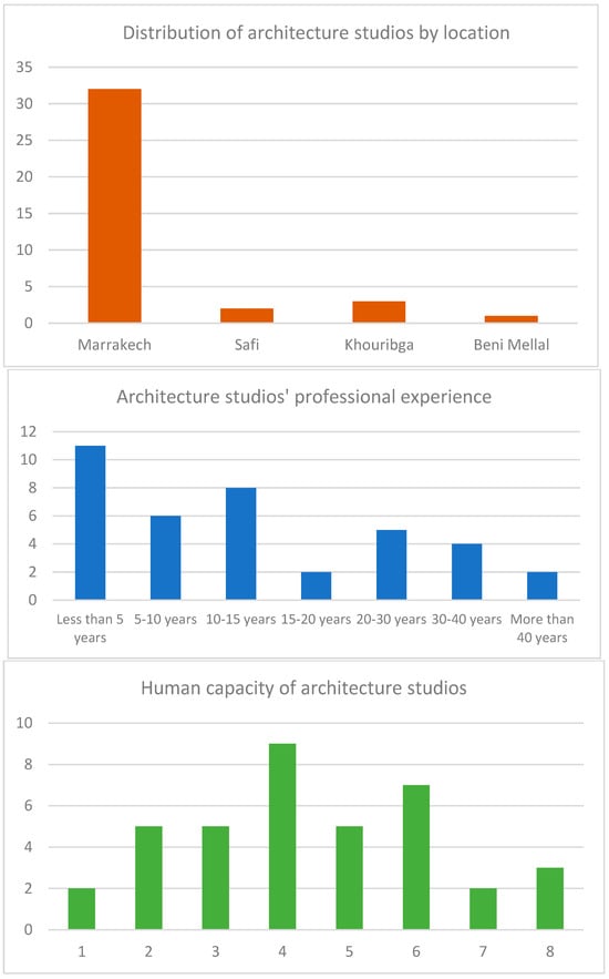 The second survey targeted architecture studios. Rather than interviewing studio owners and managers, this study chose to conduct the survey from the perspective of their interns. As 4th-year architecture students have a mandatory and graded internship, seventy-five students were interviewed regarding their experience. Students provided details about the studio of their internship in terms of their general workflow, used software tools, relationships with the civil engineering firms, and their likelihood to integrate new technologies or approaches suggested by the interninto their workflow. This approach aimed to get an honest third-party point of view about the studio, thus choosing students interning in an architecture studio for the first time instead of directly interviewing its manager. Studios outside the region of Marrakech or in different climate zones were excluded, keeping 38 studios.