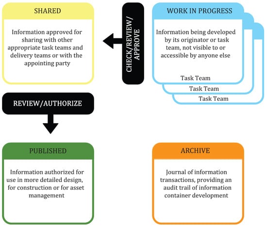 An information container’s lifecycle begins in the work-in-progress (WIP) stage (Figure 2), where task teams develop information independently. When the information is deemed to be the required standard for that stage of the work, it is checked, reviewed, and approved to move to the shared stage, allowing for collaborative refinement. Information that satisfies the requirements then progresses to the published stage, marking its readiness for use in construction. Finally, the archive stage is a repository for past versions and changes, maintaining a comprehensive audit trail of the information’s development [35].