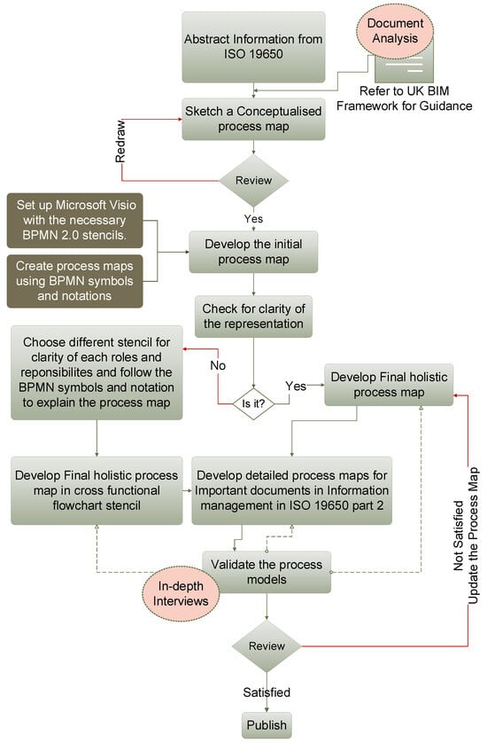 The main methods used in undertaking this study are document analysis and qualitative in-depth interviews. Employing the document analysis approach, a systematic approach was used to review and/or evaluate documents—both printed and electronic versions of ISO 19650-1 & 2. The UK BIM Framework for Guidance documents (printed and electronic) were used to clarify the concepts in the standards. The printed version allowed for themes to be made bold-marked in different colours to facilitate organisation and understanding, while electronic versions allowed for the rapid search of terms. The identified concepts were examined and interpreted in order to elicit meaning, gain understanding, and develop empirical knowledge. Upon completion of the elicitation process, the modelling process was undertaken using BPMN 2.0 and MS Visio 2024.