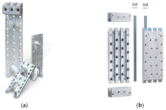 Four types of pre-engineered connectors [8] were used to connect the beams to the posts: (1) RICON S vs. 290 × 80 mm (referred to as “RCN 290”); (2) RICON S vs. XL 390 × 80 mm (referred to as “RCN 390”); (3) MEGANT 430 × 150 mm (referred to as “MGT 430”); and (4) MEGANT 550 × 150 mm (referred to as “MGT 550”). The RICON beam-hanger system, shown in Figure 2a, is made from mild steel [28], featuring a welded “collar bolt”. RICON consists of two identical components and is installed using Ø 10 × 100 mm ASSY VG CSK STSs to columns and Ø10 × 200 mm ASSY VG CSK STSs to beams. The MEGANT beam-hanger system, shown in Figure 2b, is made from aluminum [28]. The system includes two connector plates, two clamping jaws (one threaded and one unthreaded), and two threaded rods, along with washers and nuts that secure the assembly. The system utilizes ASSY VG CSK Ø 8 × 160 mm STSs, installed at 45° and 90° to the surface.