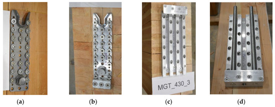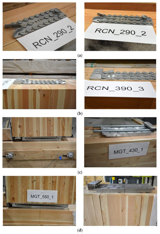 The connector failure modes are shown in Figure 8. In the RICON connectors, at an axial load equal to 5% of the factored shear resistance of the connectors, no signs of connector or wood element failures were observed. The global failure of the RICON connectors was plastic deformation taking place in the “collar bolt” of the connector as well as bending of the connector plate, as shown in Figure 8a,b. At the ultimate axial load, no screw failure was detected in the RICON connectors. In the MEGANT connectors, no failure was observed when the axial load was equal to 5% of the factored shear resistance of the connectors (Figure 8c,d). The global connection failure was a combination of connector yielding, uplift of the plate’s end without the clamping jaw, and residual deformations, which could be observed as a gap between the two plates at the ultimate load. The clamping jaw of the MEGANT connectors experienced no uplift or deformation.