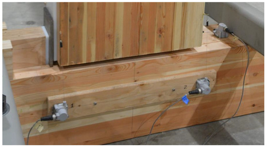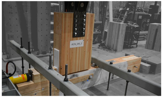 Glulam Douglas Fir 24F-EX 265 × 646 and Douglas Fir 16C-E 265 × 380 were used for beams and posts, respectively. The moisture content was determined using an electric resistance meter and had an average value of 10.7%.