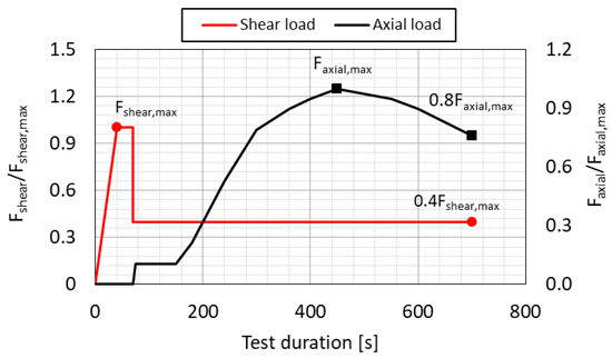 The loading protocol, adopted from ISO 6891 [32], is depicted in Figure 6. The loading procedure consisted of four steps as follows: (1) a shear load equal to the factored down-load resistance (factored shear resistance) of the connector was applied at a rate of approx. 5 mm/min; (2) a nominal axial load equal to 5% of the factored shear resistance of the connector, taken from [8], (target axial load) was applied at a rate of 5 mm/min; (3) the shear load was reduced to 40% of the factored shear resistance of the connector; and (4) the axial load was increased at a rate of 5 mm/min until failure. In these tests, failure was defined as a 20% drop in the resisted axial load.