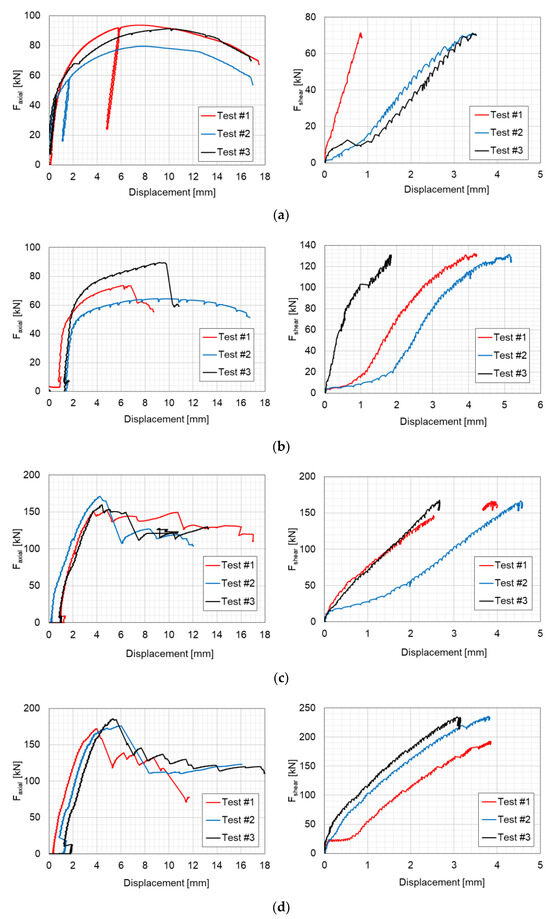 Axial and shear load vs. displacement: (a) RCN 290, (b) RCN 390, (c) MGT 430, and (d) MGT 550.