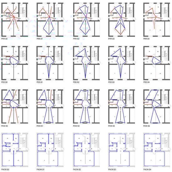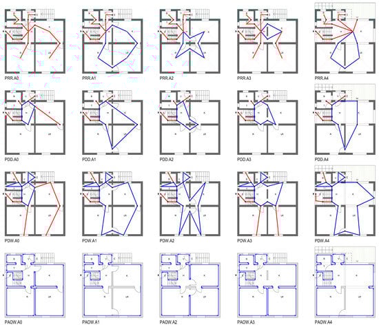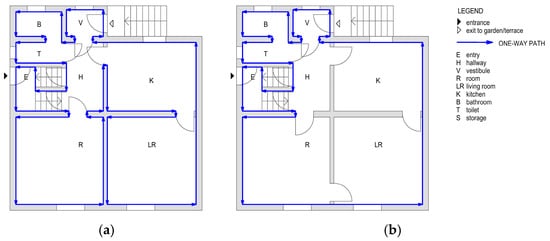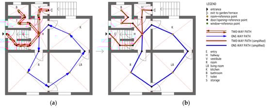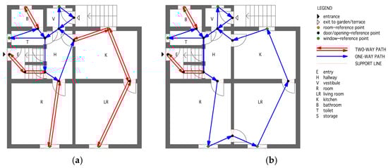 Figure 6 shows an example of an adapted house (variant PRR.A1 from the next section), in which a new door is inserted in the partition between the room and the living room, allowing circular movement from the hallway through the room, living room, and kitchen back to the hallway. The path begins at the entrance of the house, see Figure 6a, goes through the entry and up the staircase (always through the reference point—the center) to the center of the hallway—this beginning of the path is the same as in the previous case of the non-adapted house. From there, we continue through the intermediate door to the room, then through the door to the living room, and then through the next intermediate door to the kitchen. From there, we continue through the door to center of the hallway. From there, we take the same path as in the existing (non-adapted) house to the vestibule, to the exit door to the garden, and then back along the same two-way path through the hallway to the toilet and bathroom, to the hallway, and through the stairs along the same path to the start of the path—to the front door. It is worth noting that the path from the hallway, through the room, living room, and kitchen back to the hallway is a one-way circular path, marked in blue, while all the remaining path is a two-way path (we return the same way), which is drawn in red in both directions. Again, the two-way paths are further drawn with a single red line; see Figure 6b.