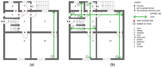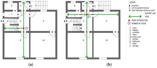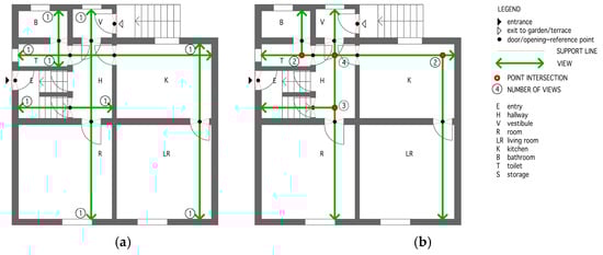 Floor plans with circular paths as a typology are special in that, at least in parts of the house or apartment, even if not entirely, circular movement can be created as a continuous flow. In practice, the spatial composition of individual rooms and the position of the openings are such that circular movements between rooms, around rooms, or around other architectural elements, such as walls, cupboards, and other furniture elements within the housing unit, are possible []. Characteristic examples of a circular floor plan design are houses or apartments with a central core (Figure 2a), usually containing service areas such as a kitchen, bathroom, storage room, or even a staircase condensed into the central core, so that the remaining living space allows circular movement around the core while providing longer sightlines and the perception of an enlarged dwelling []. Another way to construct a circular floor plan is to arrange the rooms in such a way that they have more openings than are necessary for access (Figure 2b). This gives us more possibilities to choose the way to the room and also the direction of access. The extent to which we set up circular movement depends on the needs and possibilities, the size of the home, the question of privacy, and, last but not least, the personal preferences of the users. If the passage is defined by a door, it can also be selectively opened, closed, or locked so that the passageway can be regulated over time according to the specific needs of the users [,] (for example, a cupboard can be placed in front of the door when the passage is not in use, or they can be temporarily hidden). If you install more than one door/opening in a room, the question of their positioning arises—where should they be placed so that they do not interfere with each other? In architectural practice, we find that they are often placed axially—in several consecutive rooms []. Another approach is to place doors/openings as far away from the existing door as possible, depending on the spatial possibilities. Examples of circular designs also show the placement of secondary doors/openings close to or next to the outer walls of the building []; above all, the actual position should always be contextual.