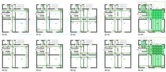 The quality of housing floor plans has a direct impact on people’s quality of life and is linked to many space-related factors, such as the size of the housing unit, its orientation, its spatial configuration, the distribution of the various functions, the size and proportions of the individual rooms, and the visual perception within the unit, but also towards the outside [,,]. However, one of the more important and often less considered aspects related to spatial organization concerns the ways in which people move between the spaces of a given unit, such as an apartment, including the characteristics of interior pathways and the preferences of users []. The configuration of paths and access to spaces can vary depending on various parameters, such as the general organization of the floor plan and, in particular, the position of doors and other openings [,,].
