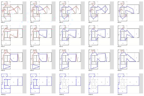 Adapted floor plan variant C4 is the best variant in terms of the path from room to room (PRR) and the path from door to door (PDD), variant C3 is the best in terms of the path from door to window (PDW), and variant C2 is the best in terms of the path along the outer walls (PAOW).