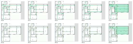 The floor plan of Case C showed a different composition of spaces compared to Cases A and B, although we obtained similar results. The addition of an extra door to the selected spaces, such as the kitchen (K), room 1 (R1), room 2 (R2), and the storage room (S), extended the length of the circular one-way path. Furthermore, the strategic positioning of the doors and openings aligned with each other (the H1-K-S1-R2 visual axis) allowed for longer and multiple views in addition to a longer one-way circular path. As in Case A, the most efficient variant in terms of movement and visibility was the one with the most rigorous transformation (C4).