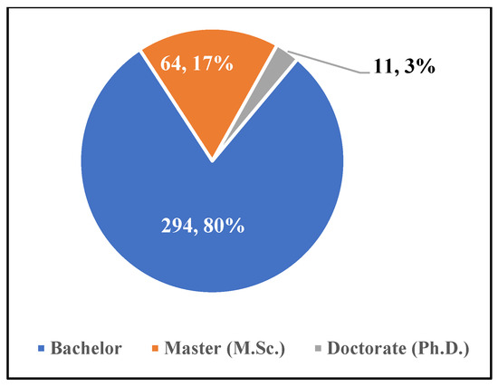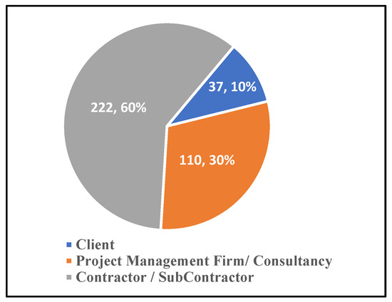 This section presents the demographic information of the respondents. The survey questionnaires were collected from 37, 110, and 222 owners, management firms/consultants, and contractors/subcontractors, respectively, as presented in Figure 2. In terms of the highest level of education achieved by the participants, the results indicate that 79.7% held a bachelor’s degree, 17.3% held a master’s degree, and 3% held a doctorate, as shown in Figure 3.