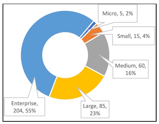The size of the participants’ companies based on the number of employees in their companies was divided into five categories, namely Micro (1–10 employees), Small (11–50 employees), Medium (51–250 employees), Large (251–1000 employees), and Enterprise (1000+ employees), and the number of participants related to these categories was 5, 15, 60, 85, and 204, respectively, as illustrated in Figure 4.