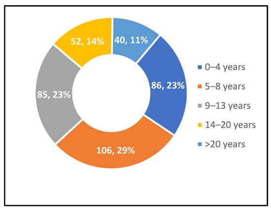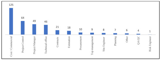 Furthermore, based on the questionnaire results, 86 of the respondents have 0–4 years of experience, 106 have 5–8 years of experience, 85 have 9–13 years of experience, 52 have 14–20 years of experience, and 40 have more than 20 years of experience in the construction field, as shown in Figure 5. Additionally, the respondents were chosen from a variety of sections/positions to obtain comprehensive responses to the cost factors associated with Egyptian construction projects, as illustrated in Figure 6.