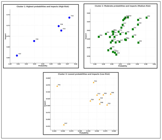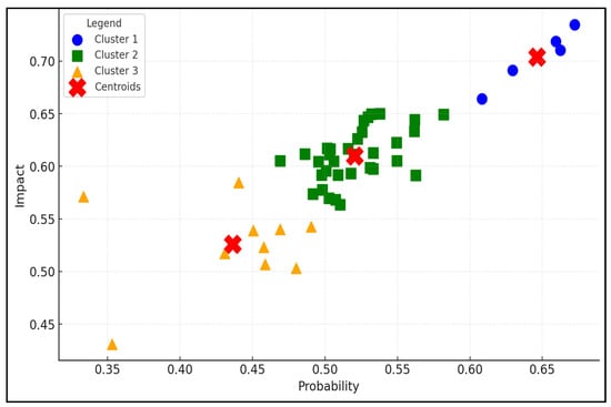 The K-means clustering analysis grouped these factors into three separate clusters based on their probability and impact scores: Cluster 1 (High Risk) includes Inflation (F16), Currency Issues (F38), Cost of Materials (F15), Market Fluctuations (F39), and Economic Challenges (F37). These factors exhibit the highest probabilities (0.61–0.67) and impacts (0.66–0.73), emphasizing their critical influence on cost increases. Cluster 2 (Medium Risk) encompasses 33 critical factors. These factors have moderate probabilities (0.47–0.58) and impacts (0.56–0.65). Cluster 3 (Low Risk) includes 10 factors with the lowest probabilities (0.33–0.49) and impacts (0.43–0.58).
