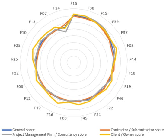 On the other hand, positive differences like Wastage of Materials on Site (F24) have a positive difference (+0.047), implying that contractors are greatly affected by waste on site, leading to an increase in the planned budget. The differences for factor (F18) Delayed Payments by Owner for Contractors (+0.03) show the extent to which contractors are focused on receiving payments and that owners’ payment delays have a significant impact on the project.