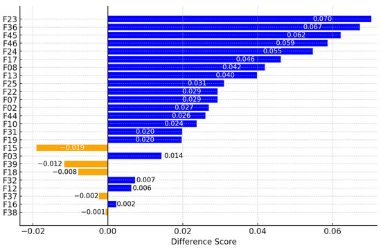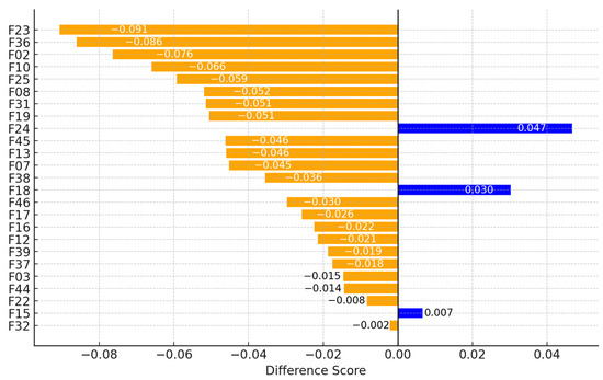 The most significant positive difference is for Design Inefficiencies (F23) (+0.070) and Delays in the Design Stage (F36) (+0.067), both highlighting owners’ strong focus on the design phase. This analysis confirms owners’ prioritization of ensuring efficiency and timeliness in design, recognizing its critical impact on project timelines and costs. In addition to the design phase, owners also place notable importance on factors such as Subcontractor Experience and Performance (F08), Contractor Experience (F07), and Contractual Ambiguity and Contradiction (F13). These factors reflect owners’ concerns with ensuring that all parties involved in the project are competent, well-coordinated, and operating under clear and consistent contractual terms to minimize risks and enhance project performance.