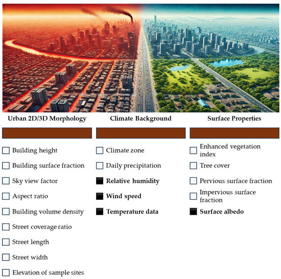 - Shao, L.; Liao, W.; Li, P.; Luo, M.; Xiong, X.; Liu, X. Drivers of Global Surface Urban Heat Islands: Surface Property, Climate Background, and 2D/3D Urban Morphologies. Build. Environ. 2023, 242, 110581. [Google Scholar] [CrossRef]