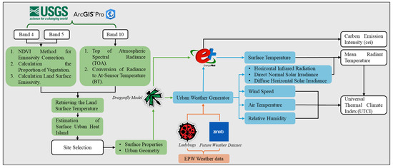 The methodology of this study comprises two sections, as illustrated in Figure 2. The initial section is devoted to the analysis and detection of the urban area experiencing the intense SUHI effect. This is followed by the selection of the study area through the utilization of remote sensing techniques. The subsequent section involves the evaluation and simulation of the mitigation scenario of green walls.