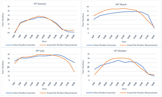 Weather data for creating site weather conditions were retrieved from Ladybug Tools EPWmap with the hourly temporal resolution [41] and the site meteorological measurements data gathered from [42] with hourly temporal resolution. The future meteorological data of the year 2050, considering RCP 8.5, relies on dynamical downscaling, following the approach outlined by the IEA EBC Annex 80 [43]—Weather Data Task Force. The most advanced approaches and tools for producing future global projections and weather files are referenced [44].