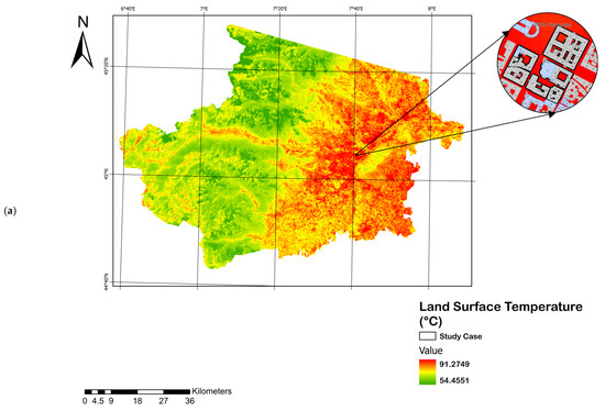 The final step prior to calculating the SUHI value was to compute the Land Surface Temperature (LST). Utilizing the BT value previously obtained from Equation (2), the LST in degrees Celsius (°C) can be calculated through the application of Equations (6) and (7) [46,47] and the input parameters delineated in Table 3.