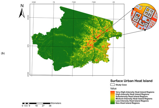 (a) Land surface temperature (°C) and study area detection; (b) SUHI ranges and study area detection.