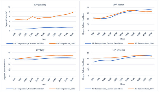 In considering the broader context of urban heat island effects, future climate projections for 2050 are anticipated to exacerbate this phenomenon (Figure 5). However, the implementation of green walls could help counteract this trend by producing smaller temperature increases and more significant reductions, ranging from −1.6 °C to 0.7 °C, which highlight their potential as an effective mitigation strategy in the face of climate change. For instance, on 29 July, air temperatures under the current climate scenario exhibited some increases throughout the day. In contrast, future climate projections for 2050 demonstrated a consistent decline in temperature during the mid-afternoon hours. A similar trend was observed in winter. While early mornings—8:00 AM and 9:00 AM—under current conditions exhibited slight increases in air temperature, future projections indicated a notable decrease throughout the day, with more substantial reductions. The enhanced effectiveness under future climate scenarios suggests that green walls may become increasingly valuable as a climate adaptation strategy.