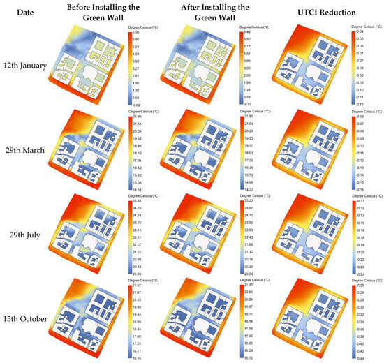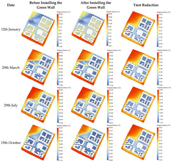 In the case of the future projection 2050, in all the simulation periods we will experience higher outdoor air temperatures (Figure 5). In autumn and winter, instead of having warmer outdoor temperatures, the cooling effect of green walls was less impactful, with the mitigating from −0.34 °C to −0.18 °C on 15 October and −0.13 °C to −0.07 °C on 12 January. Considering having lower spatial Tmrt in 2050 because of lower radiation (Figure A1), and since solar radiation is a key driver of evapotranspiration, this condition results in less energy available to evaporate water from the soil and transpire water through the plants, thus having less cooling potential of green walls. Similarly, on 29th March, by considering having relatively higher air temperature and lower solar radiation (Figure A1), leading to lower spatial Tmrt, and better cooling performance with the averaged reduction from −1.25 °C to −0.67 °C. This could be the result of a greater temperature difference between air and surfaces resulting in better heat transfers.