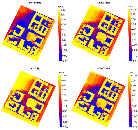 Accurate building footprints have significant implications for urban planning and infrastructure management [49]. The geometric model that served as the foundation for all simulations was developed using the Rhinoceros 8 modeler. The dragonfly model was created based on dragonfly buildings from footprint geometry (horizontal Rhino surfaces). The buildings were created with the extrusion from building footprints based on digital elevation models, which represent an approximation of the building massing [50]. In addition to the selection of the urban site, the decision was made to decrease the run time for the comfort analysis by employing short time periods of four days taken from typical weeks in the (stat) file in the weather file of the weather station in Turin-Caselle Airport [41] (Table 4). The time period from 8:00 to 18:00, when the majority of activities are conducted, was selected for the simulation [12,33,51,52].