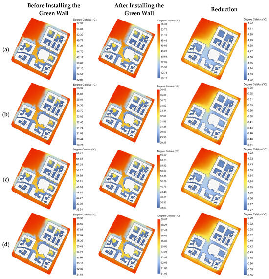3.2. Impact of Green Walls on Outdoor Air Temperature for Current Condition and Future Projection