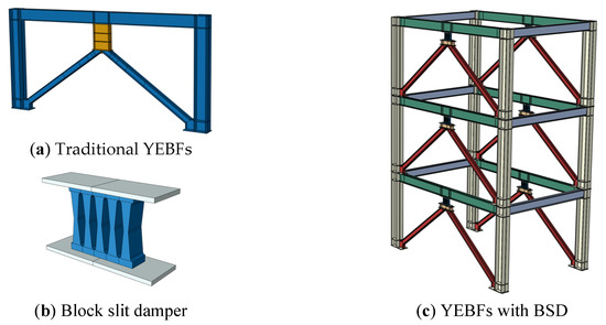 Given the aforementioned information, this study proposed a YEBF with a block slit damper, as shown in Figure 1c. The hysteresis performance of YEBFs with different types of BSDs was investigated via the FE software ABAQUS 6.14. Furthermore, a detailed comparative analysis was conducted between YEBF with BSD (BSDF) and traditional YEBF (TEBF) to evaluate their hysteresis performance under cyclic loading. This work aimed to provide insights into the use of BSDs in YEBF structures.