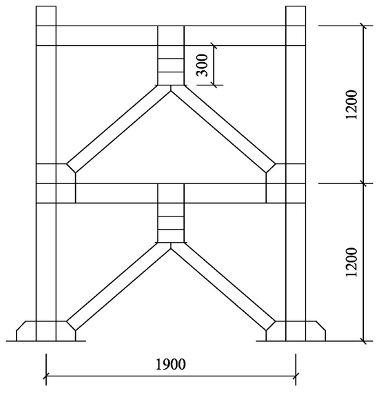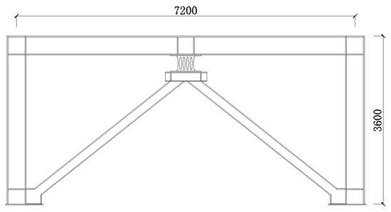 To validate the accuracy of the EBF model, this study established an FE model of specimen Y-1 from the 1/3 scale single-span, two-story frame test in reference [25] according to the relevant provisions of the Chinese standard (GB 50011-2010; JGJ 99-2015; GB 50017-2017) [26,27,28]. A schematic diagram of the YEBF is shown in Figure 2, and the detailed dimensions of the relevant components are presented in Table 1.